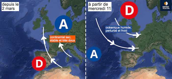 Évolution de la situation entre ce que nous avons connu depuis le 2 mars, et ce que nous allons connaître à partir du 11 mars - schémas Meteo-villes