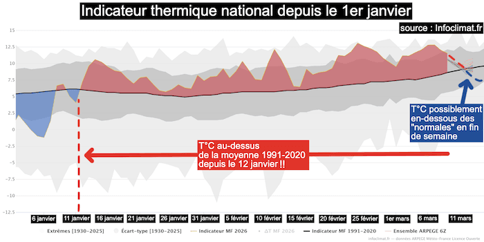 Évolution de l'indicateur thermique par rapport à la normale quotidienne en France depuis le 1er janvier 2026 - source : Infoclimat.fr