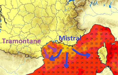 La chute de la température associée au vent pourrait également créer un phénomène dit "d'upwelling". Le Mistral et la Tramontane ont en effet tendance à pousser les eaux chaudes de surface vers le large, faisant remonter des eaux froides. Ce phénomène, déjà visible entre Marseille et Toulon suite au Mistral de la semaine pourrait se propager à la totalité du Golfe du Lion avec des températures de surface de la mer chutant jusqu'à +17°C en fin de semaine!