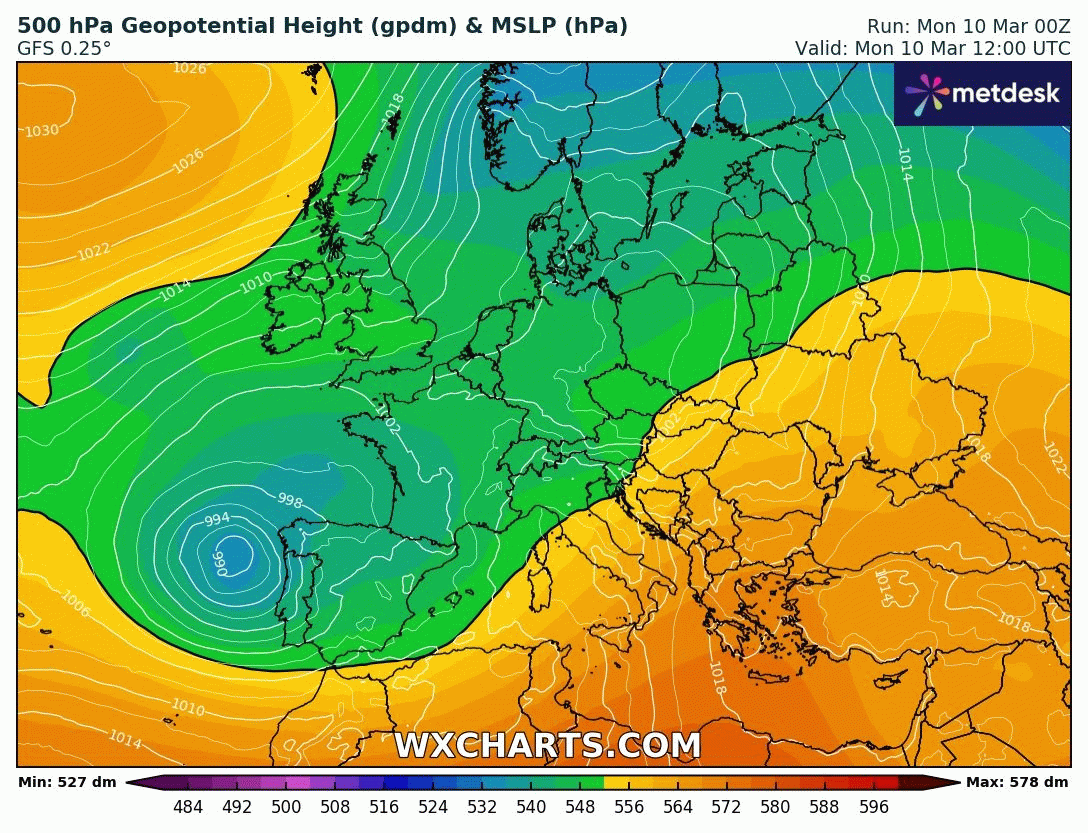 Animation des geopotentiels sur l'Europe du 10 au 16 mars 2025 – modèle GFS via WX CHARTS