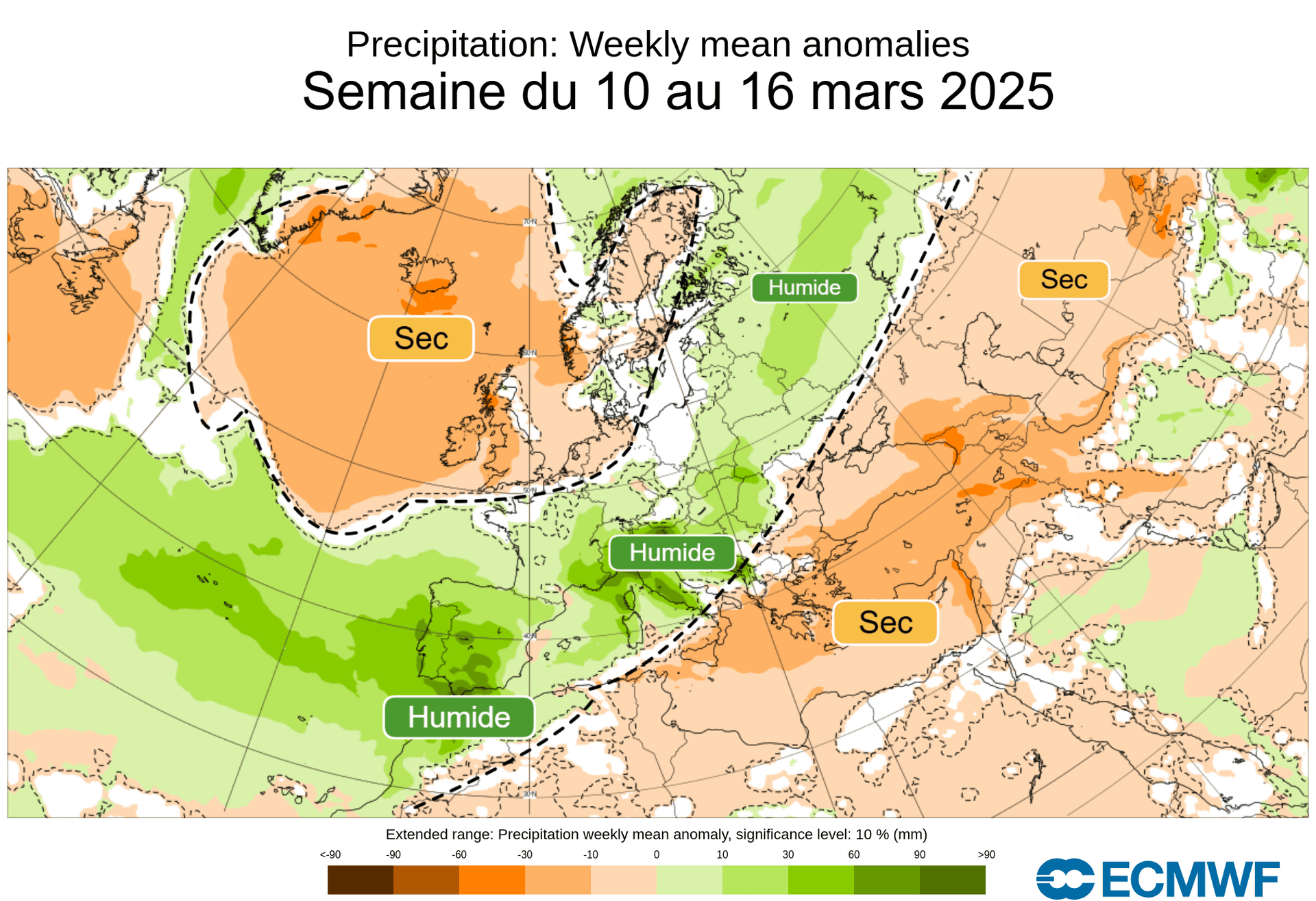 Anomalies de précipitations sur l'Europe pour la semaine du 10 au 16 mars 2025 – ECMWF