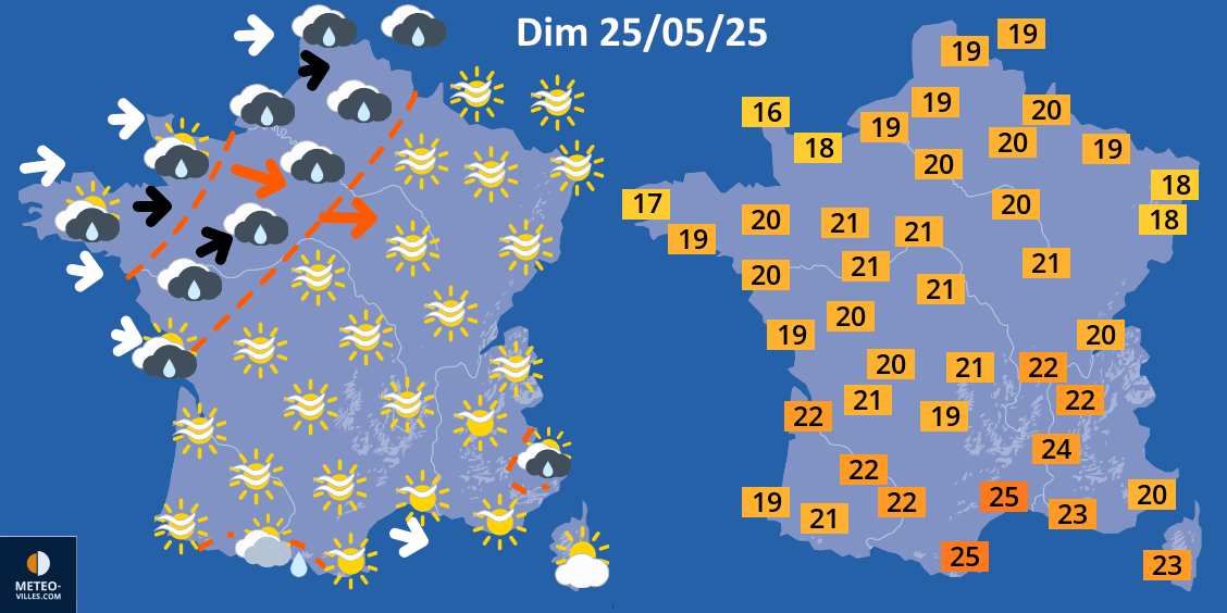 Le flux océanique amènera un front pluvieux sur le nord-ouest de la France en journée du dimanche 25 mai 2025, donnant des pluies d'activité faible à modérée et un vent sensible. Dans le sud et l'est, le temps sera plus lumineux bien que le ciel se montrera voilé. Il fera globalement doux, sauf près de la Manche où on attend seulement 16 à 18°C. Ailleurs, il fera 19 à 22°C en général et jusqu'à 23 à 25°C sur les départements méditerranéens.