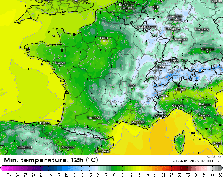 Températures minimales prévues le samedi 24 mai 2025 - meteologix.com
