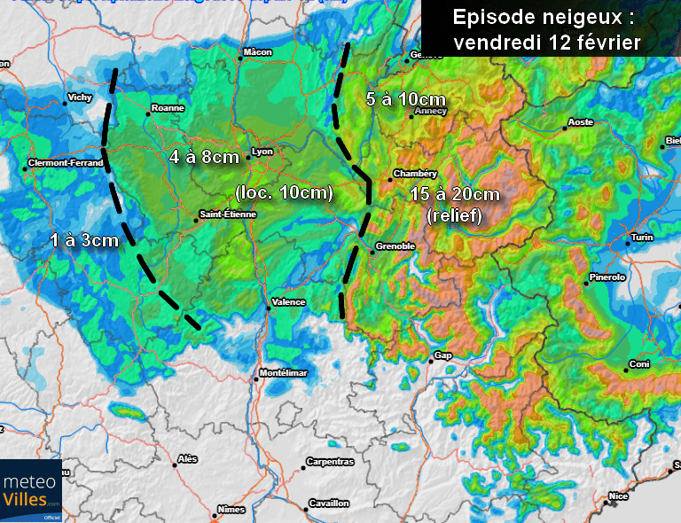 La neige perd graduellement en intensité en fin de soirée sur ces régions avec entre 2 et 5cm relevés près de Lyon, Chambery ou Genève, entre 5 et 8cm sur Grenoble et parfois plus de 10cm sur le nord de l'Isère et certaines vallées alpines. Les conditions de circulation sont très difficiles dans ces secteurs en raison des routes verglacées et enneigées.
