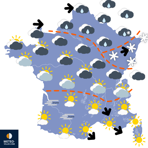 Ainsi, c'est un flux de Nord à Nord-Ouest qui concerne notre pays depuis samedi, advectant un air froid venu du pôle. Comme ce flux est d'origine maritime, le froid reste modéré mais est fortement chargé en humidité, favorisant de fréquentes précipitations souvent sous forme de neige jusqu'en plaine.