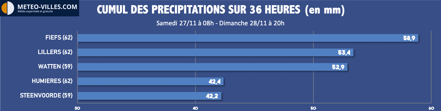 Par ailleurs au sein de ce flux de Nord, des pluies abondantes se sont abattues durant l'ensemble du week-end sur les Hauts-de-France, touchant notamment les bassins de la Lys et de la Lawe-Clarence. Avec des cumuls supérieurs à 60mm en l'espace de deux jours, ces cours d'eau sont entrés en crue, provoquant des inondations en Flandre. 65 personnes ont du être évacuées sur les communes de Arnèke, Esquelbecq et Wormhout. En fin d'après-midi de dimanche, 99 habitations étaient inondées dans le département du Pas-de-Calais.