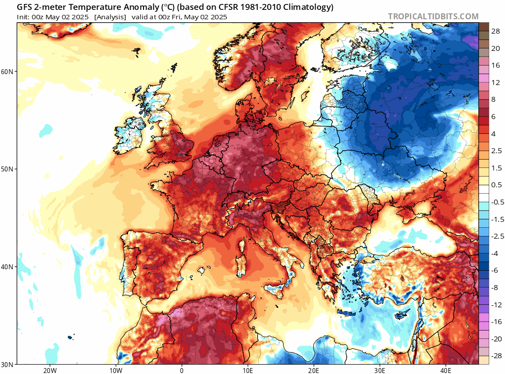 Animation des anomalies de températures sur l'Europe du 2 au 5 mai 2025 – Via TropicalTidBits