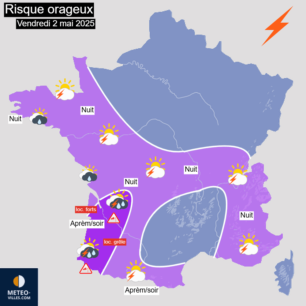 Carte du risque orageux pour le vendredi 2 mai 2025 – Météo-Villes
