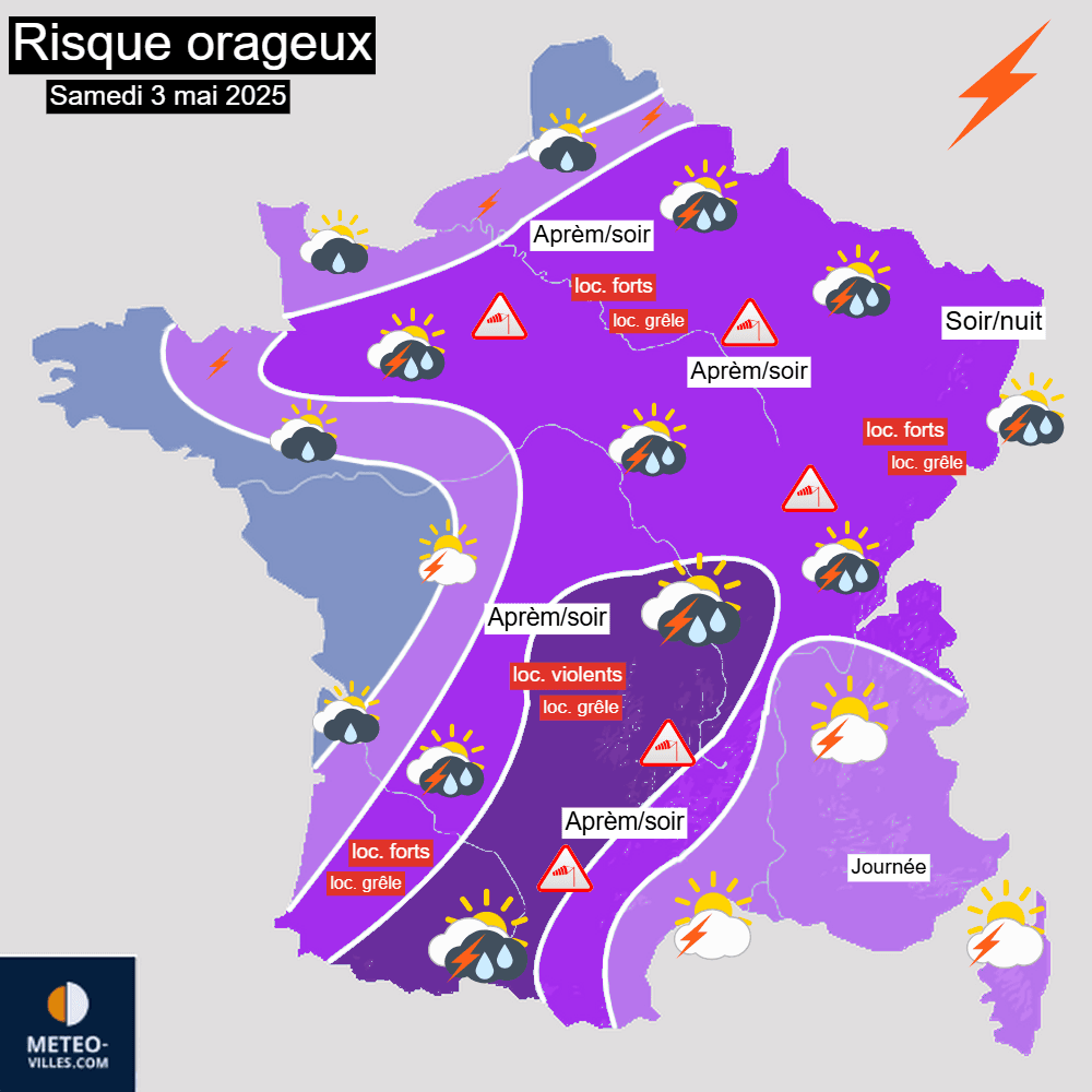 Carte du risque orageux pour le samedi 3 mai 2025 – Météo-Villes