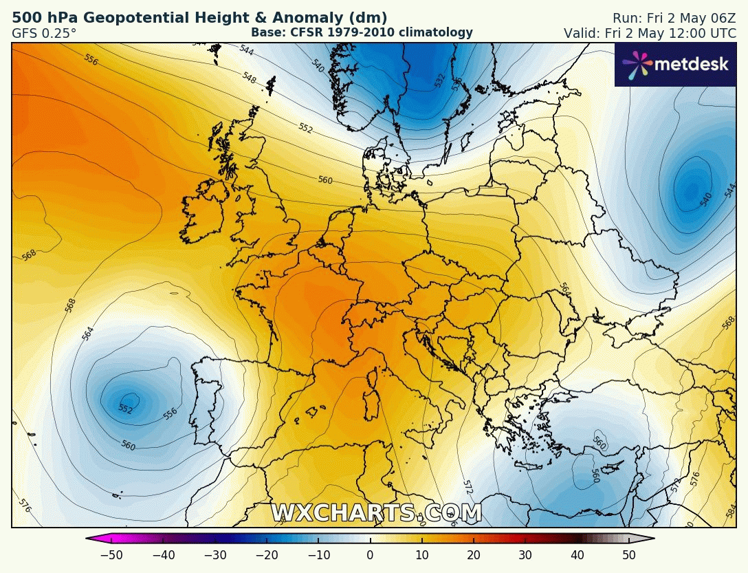 Animation des anomalies de géopotentiels à 500hPa sur l'Europe - Modèle GFS via WX CHARTS