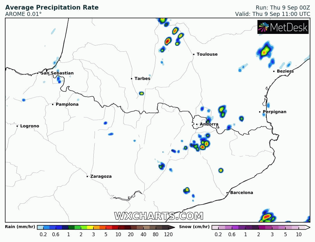 Précipitations le jeudi 9 septembre 2021 en après-midi, soirée et début de nuit - modèle AROME via meteociel.fr