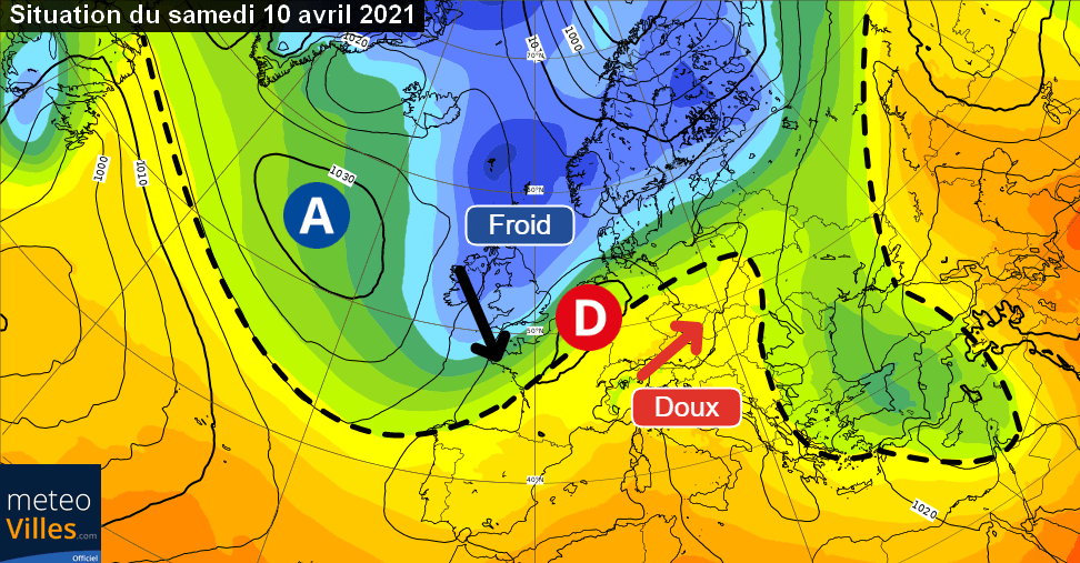 Schéma de la situation atmosphérique sur l’Ouest de l’Europe ce samedi 10 avril 2021 – ECMWF, modifié par Météo-Villes