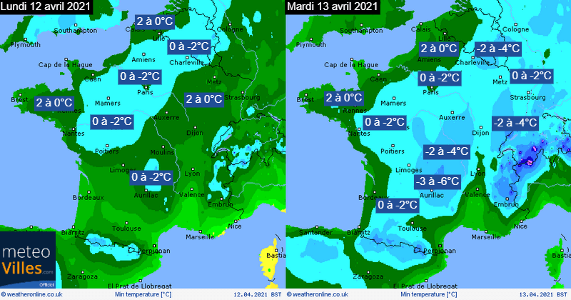Températures minimales envisagées lundi 12 et mardi 13 avril 2021 – WeatherOnline, modifié par Météo-Villes