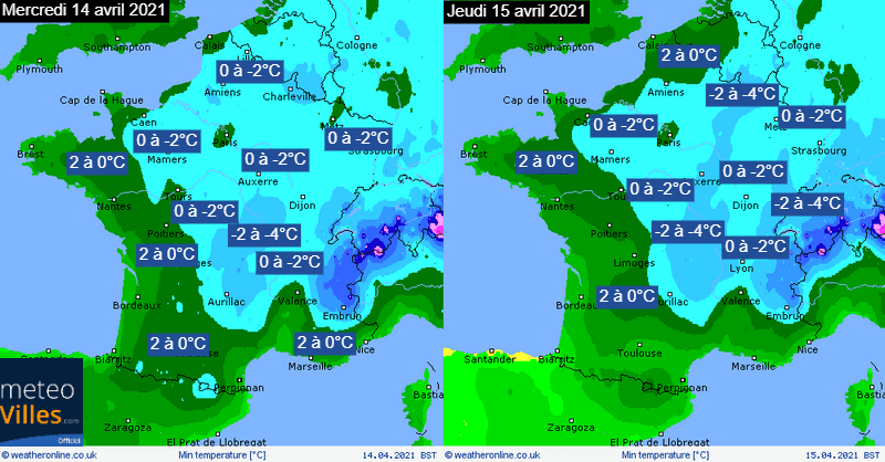 Températures minimales envisagées mercredi 14 et jeudi 15 avril 2021 - WeatherOnline, modifié par Météo-Villes