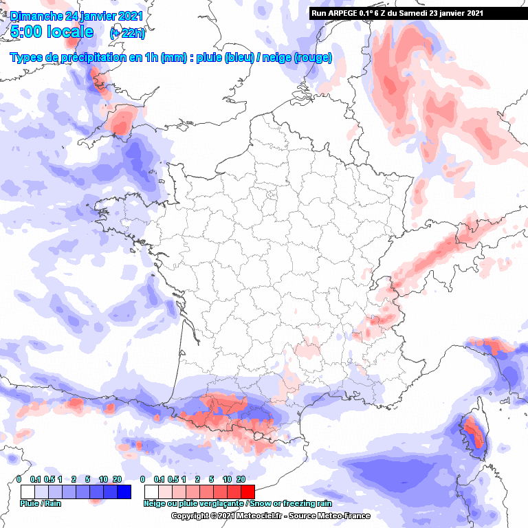 Animation des précipitations (pluie et neige) - journée du dimanche 24 janvier 2021 - modèle Arpège via Météociel