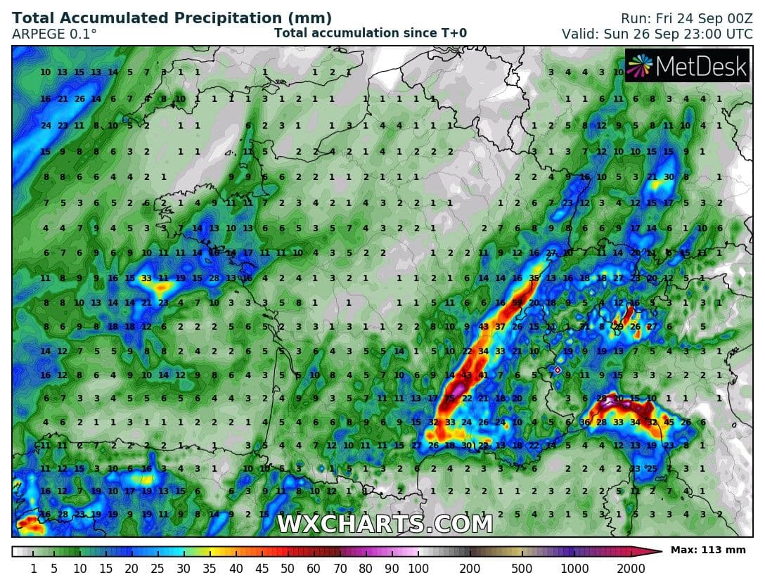 Cumuls de pluie envisagés entre samedi 25 et dimanche 26 septembre au soir – Modèle Arpège via WX CHARTS