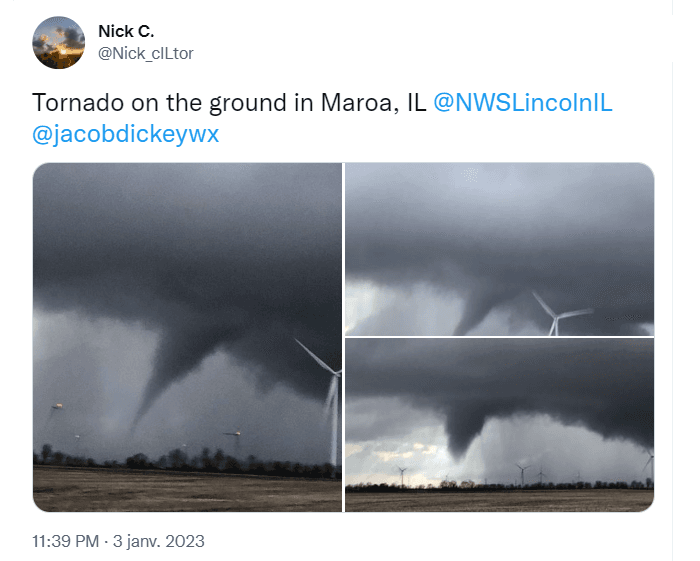 Tornade à Maroa (Illinois) le mardi 3 janvier 2023 - photos via Nick C.