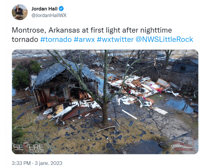 Dégâts liés à une tornade à Montrose (Arkansas) le mardi 3 janvier 2023 - via Jordan Hall