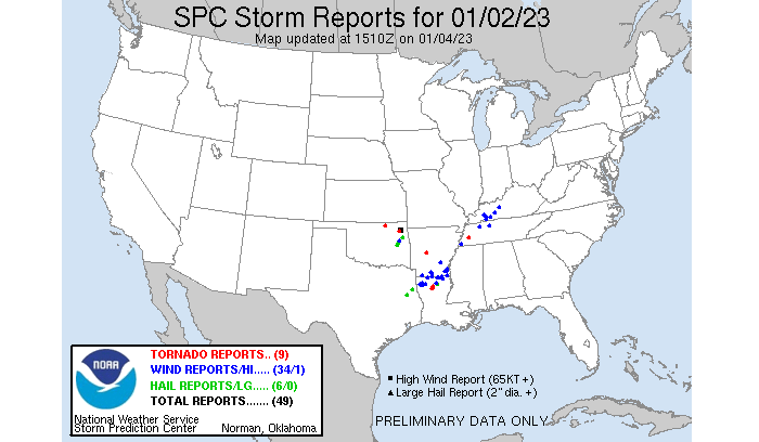 Reports de phénomènes violents aux USA les 2 & 3 janvier 2023 (rouge = tornade, vert = grêle, bleu = rafales) - via NOAA