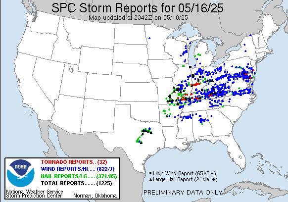 Reports de tornades, rafales, grêle et pluies intenses pour la journée du 16 mai 2025 – Storm Prediction Center