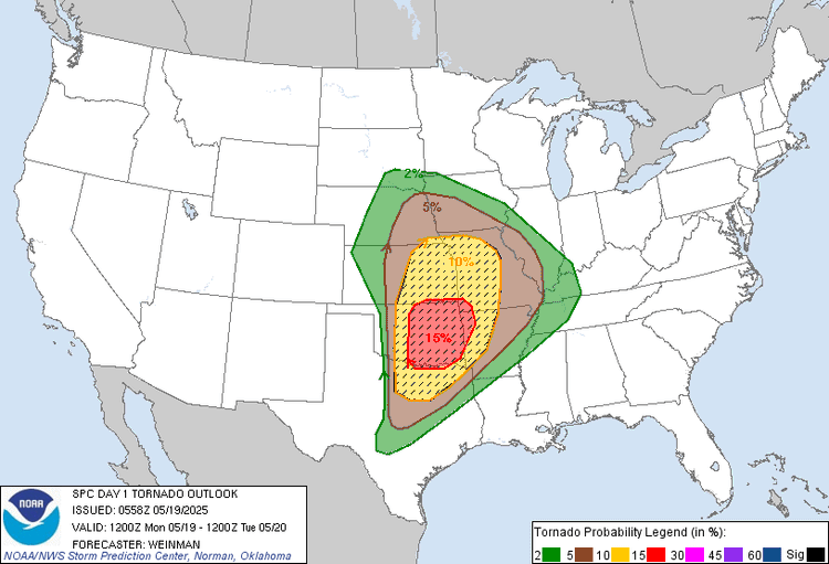 Risque d'orages et de tornades aux États-Unis ce 19 mai 2025 – SPC