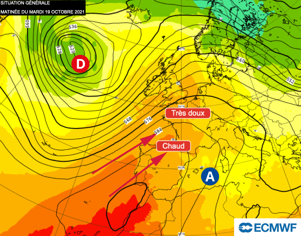 Situation générale prévue - matinée du mardi 19 octobre 2021 - ECMWF