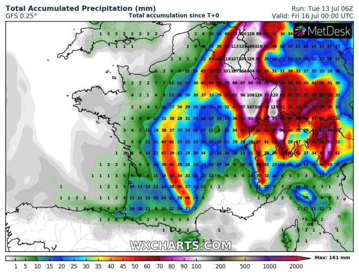 Selon les dernières prévisions, les cumuls les plus importants sont prévus entre les Vosges et le nord de la Lorraine où des valeurs de 100 à 150 mm seront possibles d'ici vendredi 15 juillet au soir. En marge, on attend souvent 50 à 100 mm des Ardennes vers le Jura, plutôt 25 à 50 mm de la Marne jusqu'au nord des Alpes. Des cumuls similaires tomberont encore vers le sud du Massif Central. Sur les autres régions, les pluies seront en voie d'atténuation.