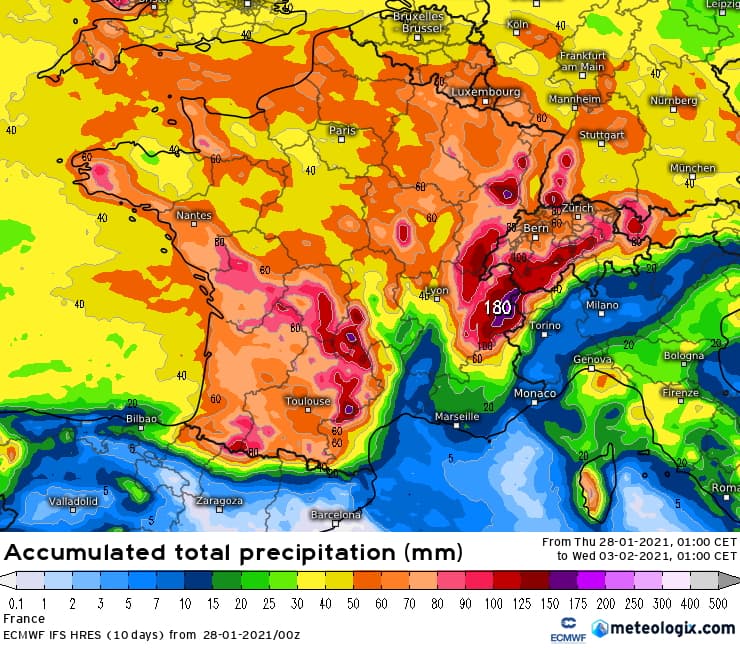Cumuls de pluie sur 5 jours du jeudi 28 janvier au mardi 2 février 2021 - modèle européen via meteologix