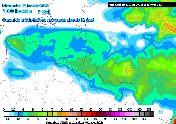 Cumuls de neige possibles en journée du samedi 30 janvier 2021 - modèle ICON via meteociel.fr