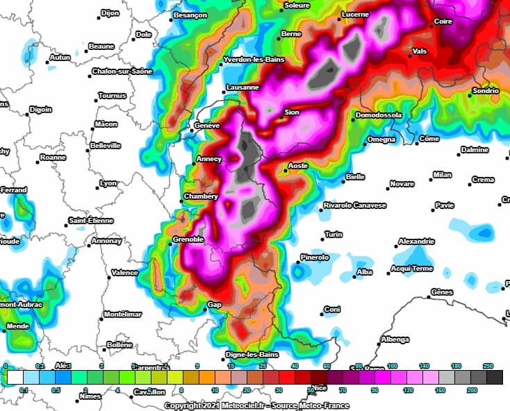 C'est en direction des reliefs que sont prévues les quantités les plus importantes, souvent de l'ordre de 100 à 150 mm sur le sud-ouest du Massif Central, les Vosges, le Jura et le nord des Alpes, jusqu'à 180 mm sur le relief savoyard ! De plus, ces pluies s'ajoutent à la fonte des neiges aux basses et moyennes altitudes, venant gonfler les cours d'eau.