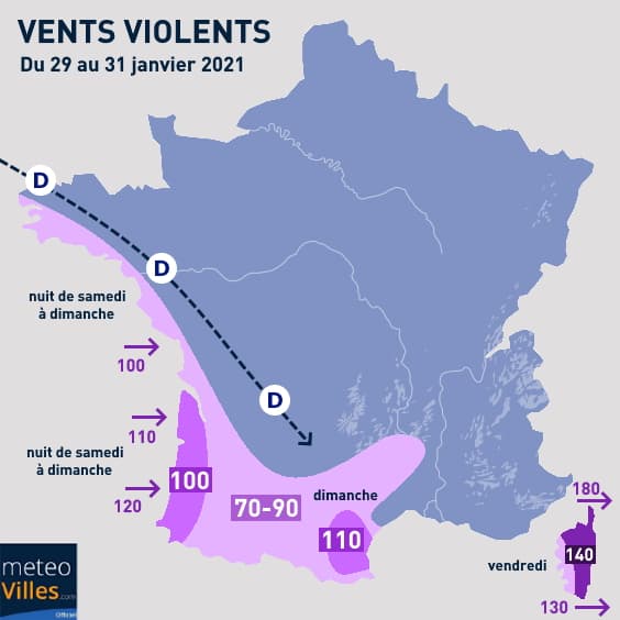 Dans un second temps, une dépression circulera de la Bretagne vers l'ouest du Massif Central durant la nuit du samedi 30 au dimanche 31 janvier 2021 en générant un coup de vent de l'arc atlantique vers le Roussillon. Des rafales de 100 à 120 km/h pourront toucher la côte aquitaine. Les vents pourront aussi dépasser les 100 km/h dans le domaine de la tramontane. Ces vents violents atteindront aussi la Corse plus tard dans la nuit.