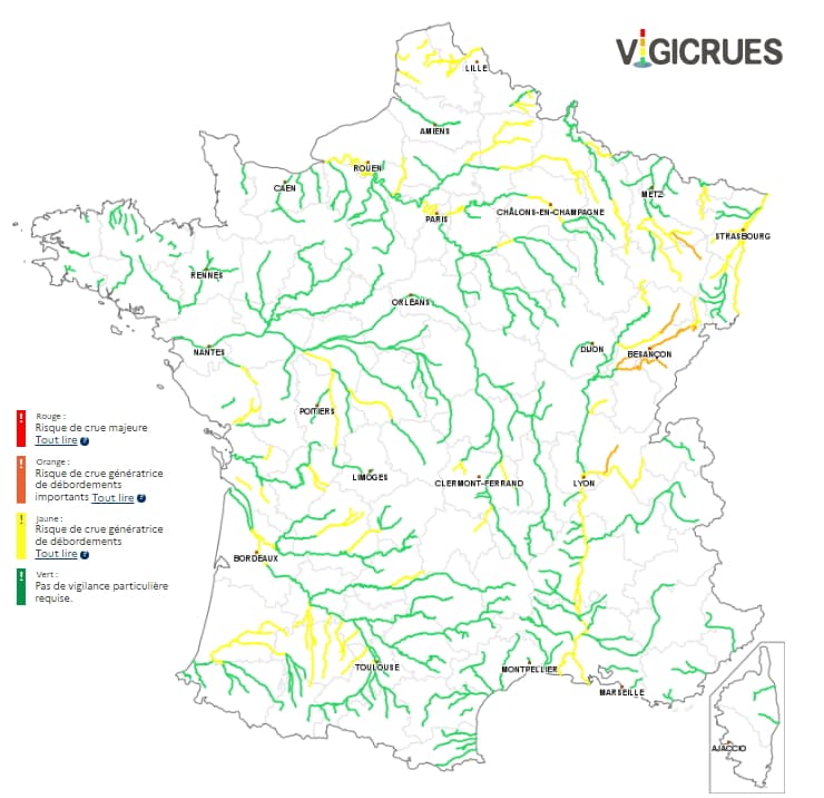 Comme l'illustre la carte de Vigicrues, de nombreux cours d'eau français sont d'ores et déjà placés en niveau jaune. C'est le cas du Rhône, de nombreux tronçons du sud-ouest et du centre-ouest mais aussi du nord de la France. Quelques débordements sont déjà observés et plusieurs tronçons pourront passer en alerte orange ces prochains jours.