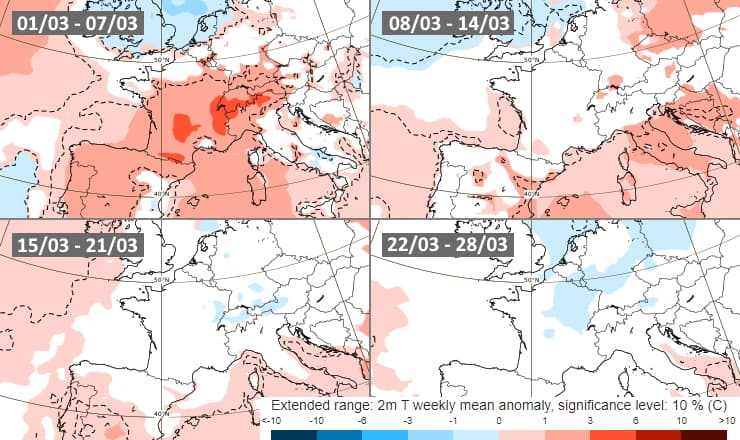 Le modèle européen met en évidence le caractère très sec de cette première semaine du mois de mars mais la tendance devrait s'inverser en milieu de semaine prochaine avec une séquence arrosée et venteuse à attendre (sauf vers la Méditerranée). Toutefois, de petites anomalies sèches reviendraient durant la seconde quinzaine du mois de mars, sans atteindre les niveaux du début de mois.