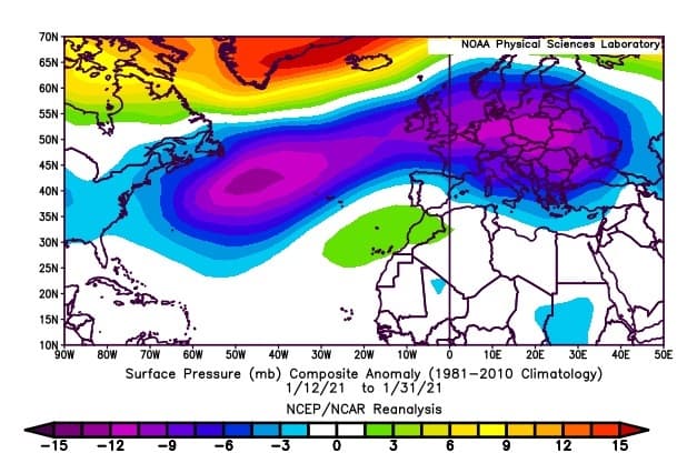 Anomalies de pression atmosphérique sur l'Ouest de l'Europe entre le 12 et le 31 janvier mettant en évidence ce flux perturbé persistant - Via NOAA