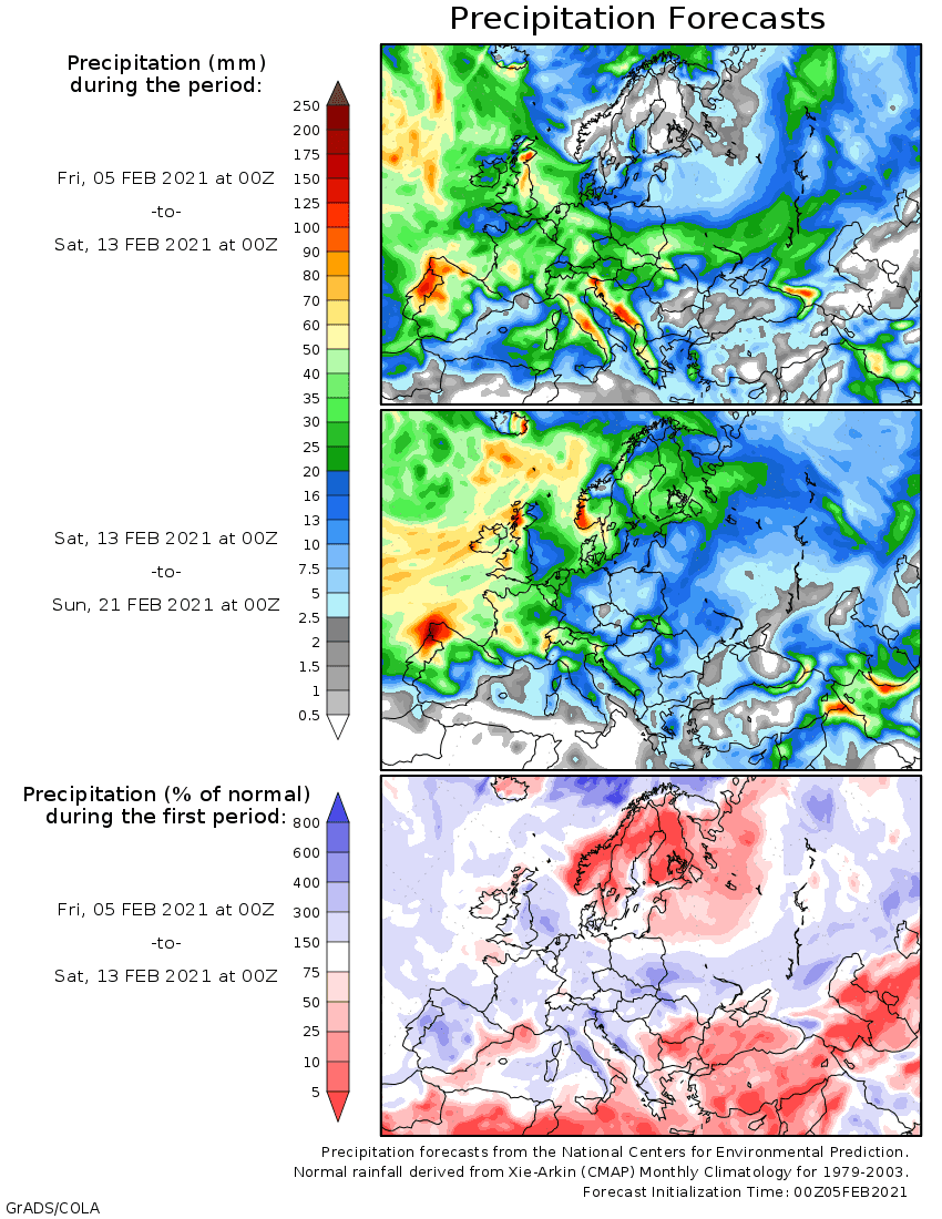 Précipitations et anomalies sur l'Ouest de l'Europe pour la période du 5 au 21 février - Via NCEP