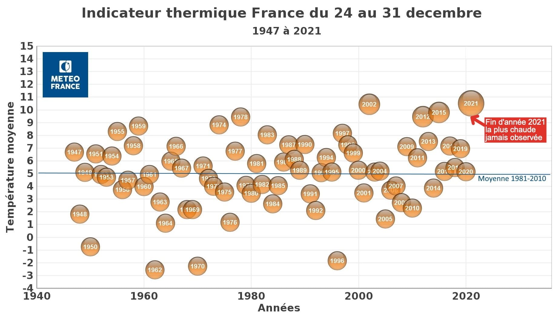 Indicateur thermique en France sur la période du 24 au 31 décembre de 1947 à 2021 - via Météo France