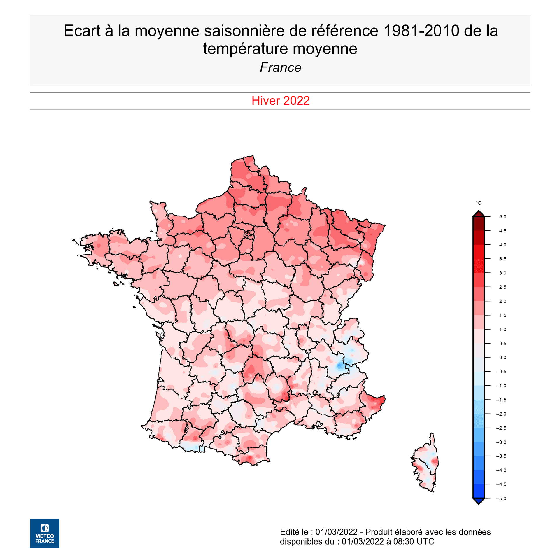 Ecart à la moyenne saisonnière de référence 1981-2010 de la température moyenne en France durant l'hiver 2021-2022 – Météo-France