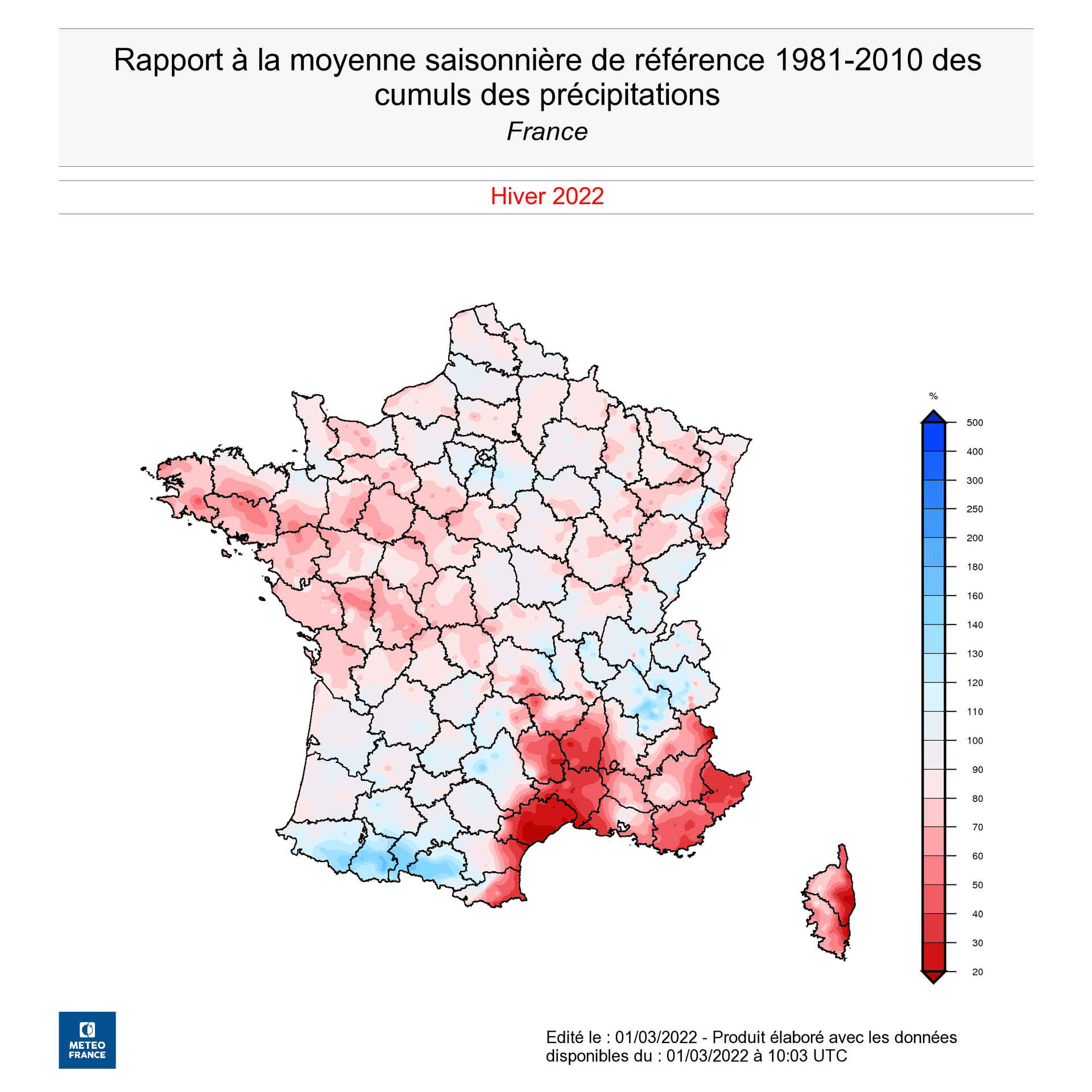 Ecart à la moyenne saisonnière de référence 1981-2010 des cumuls de précipitations en France durant l'hiver 2021-2022 – Météo-France