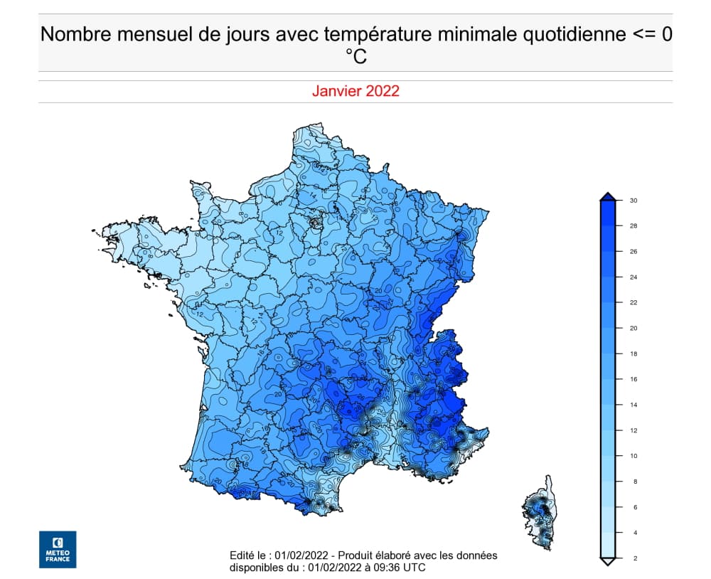 Nombre de jours avec gel matinal en France durant le mois de janvier 2022 - via Météo France / Gaëtan Heymes