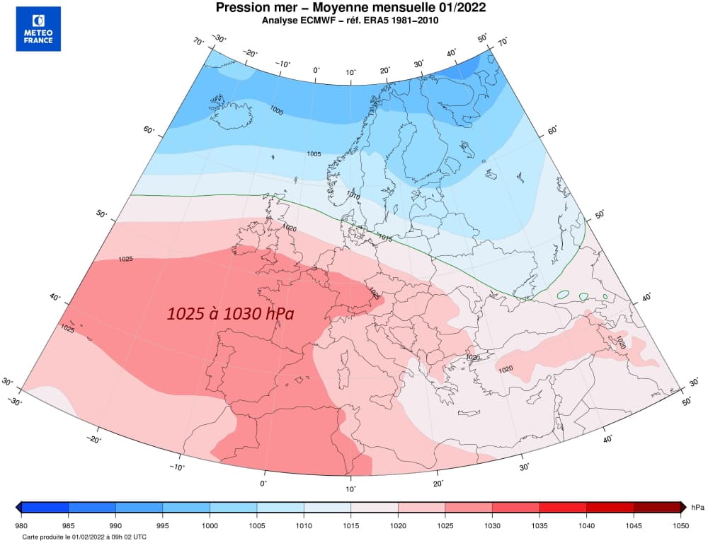 Pression moyenne sur l'Ouest de l'Europe en janvier 2022 – Météo-France