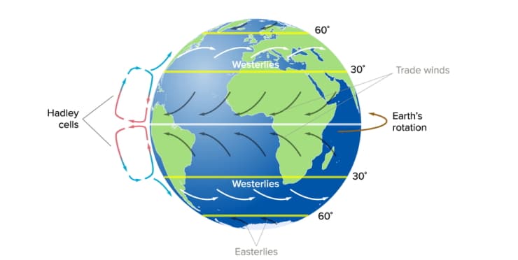 Sur l'Europe mais aussi sur le nord de l'Amérique, le vent d'ouest est majoritaire durant l'année. Il fait le tour de l'hémisphère et évolue aux latitudes moyennes (en général entre le 30ème et le 60ème parallèle), entre l'air froid situé aux hautes latitudes et l'air chaud situé vers les latitudes équatoriales. Pour qualifier ces vents circulant d'ouest en est, on peut parler de circulation zonale.