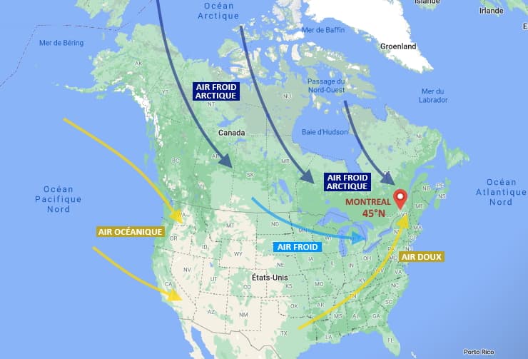 Intéressons-nous au climat de l'Amérique du Nord avec l'exemple de Montréal. Géographiquement, l'est du continent nord-américain n'est quasiment pas concerné par la douceur du flux d'ouest pour la simple et bonne raison que ce flux en provenance du Pacifique doit traverser tout le continent et a donc largement le temps de se refroidir au dessus des terres. Ainsi, un flux d'ouest au Québec n'apportera pas de douceur. Seul un puissant flux de sud-ouest sera susceptible d'advecter l'air doux présent sur le sud des USA.