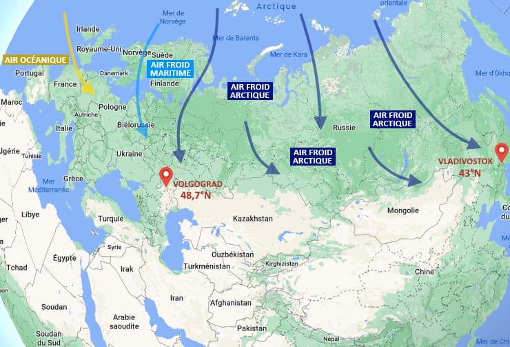 Si l'on s'intéresse à la Russie, la donne est assez similaire. Ce pays-continent correspond à de très vastes étendues terrestres, au sud d'un océan Arctique totalement gelé durant l'hiver. L'influence de la douceur de l'Atlantique peut parfois s'étendre jusqu'à l'ouest de la Russie lors des flux d'ouest les plus dynamiques mais le restant du territoire baigne quasi-constamment dans un froid net durant la saison hivernale.