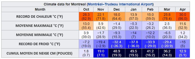 Tableau climatique d'octobre à avril à Montréal (Canada)- Wikipédia