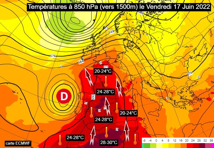 Masses d'air à 850 hPa (vers 1500m) pour le vendredi 17 juin 2022 - carte ECMWF