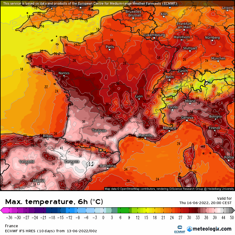 Modélisation des températures maximales du jeudi 16 au dimanche 19 juin 2022 - via meteologix.com