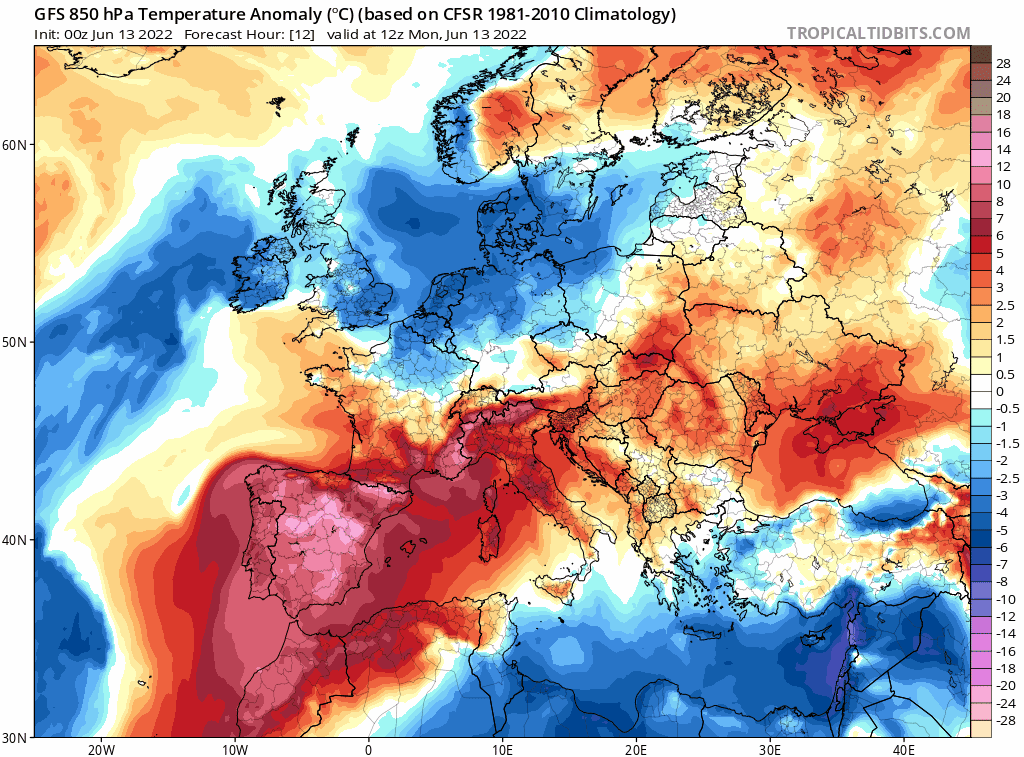 Anomalie thermique de la masse d'air du lundi 13 au samedi 19 juin 2022 - via tropicaltidbits.com