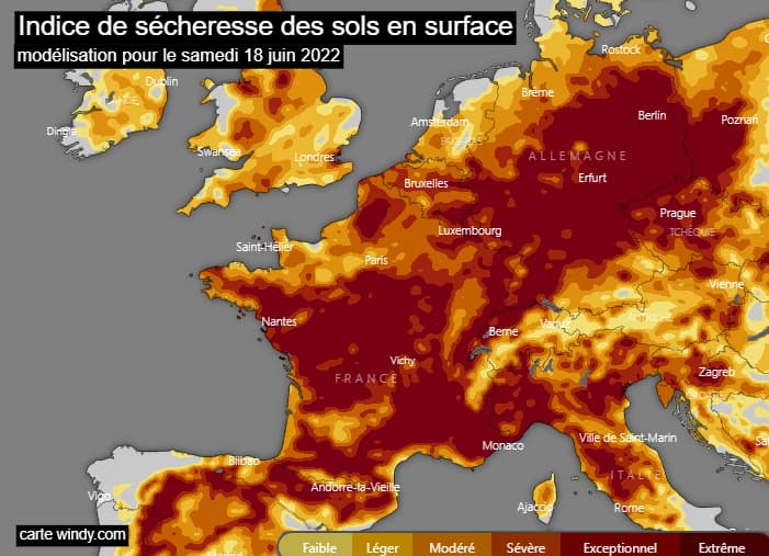 Modélisation de l'indice de sécheresse en surface pour le samedi 18 juin 2022 - via windy.com