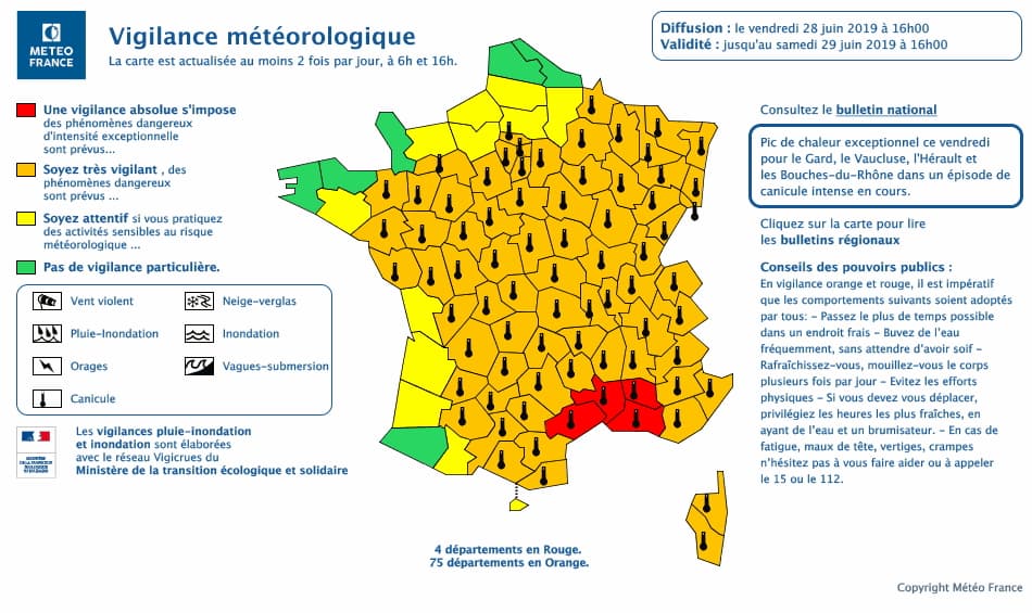 Avec cette nouvelle canicule qui se profile, 3 des 6 derniers mois de juin auront finalement connu une canicule (juin 2017, juin 2019 et donc juin 2022) ! La seconde quinzaine de juin, auparavant considérée comme à maigre risque caniculaire, se déroule désormais au rythme d'une canicule une année sur deux... Un signe évident du réchauffement climatique. Fin juin 2019, l'alerte à la canicule avait concerné la quasi-totalité de la France et le rouge avait même été déclenché dans 4 départements du sud. Il avait fait 46°C dans le Languedoc le 28 juin 2019 ! Le record national de chaleur est donc détenu par le mois de juin...