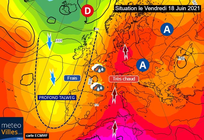 Les fortes chaleurs qui ont concerné la France la semaine dernière ont été apporté par un flux de sud très chaud en provenance directe du Maghreb. Dès le milieu de la semaine, les dépressions présentes sur le nord de l'Atlantique ont entraîné la plongée d'un profond talweg au large de nos côtes océaniques, jusqu'au Portugal. Ce dernier a contribué à accentuer la chaleur mais aussi à déstabiliser la masse d'air en causant l'approche d'air frais océanique par l'ouest.